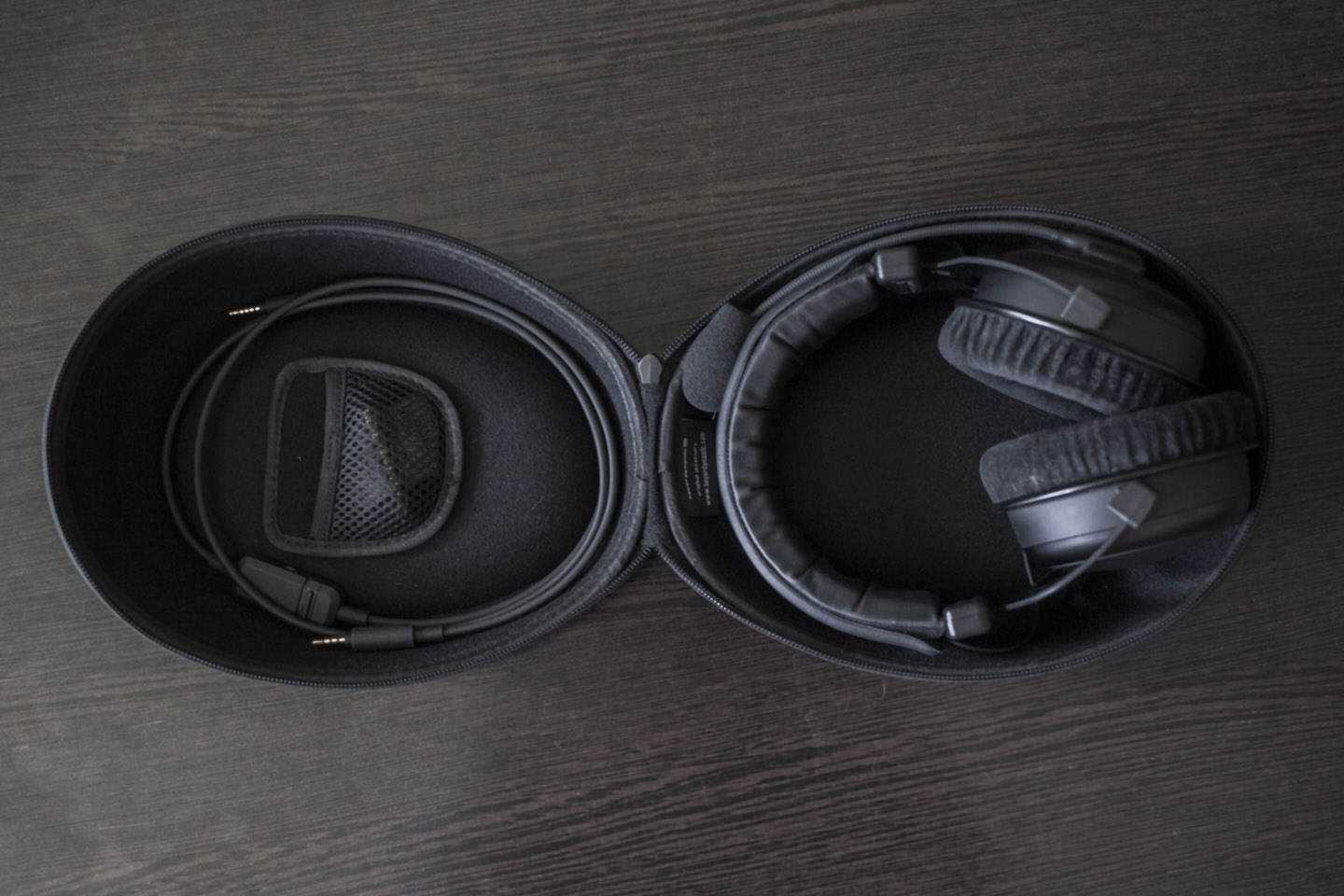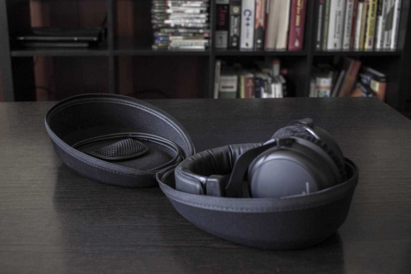 Большие, идеально круглые амбушюры (тоже съемные) полностью закрывают уши, а плюшевая отделка обеспечивает хорошую вентиляцию. Чашки закреплены на Y-образных металлических вилках и крутятся только в одной плоскости. Компактно наушники сложить нельзя, но для хранения и переноски Beyerdynamic предусмотрели жесткий кейс. В кейсе спокойно размещаются наушники и оба кабеля, а в маленький сетчатый кармашек можно положить переходник на 6,3-мм разъем, тоже входящий в комплект.