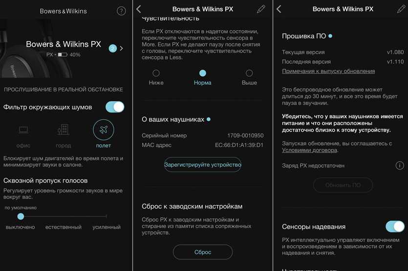 В приложении также можно настроить чувствительность сенсора, который следит за положением наушников и останавливает музыку, когда вы снимаете PX с головы.