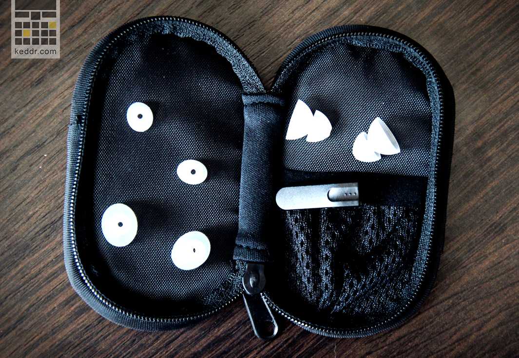 Резиновые накладки имеют овальное сечение, благодаря чему сидят они как влитые. Форма якобы настолько уникальна, что указан даже номер патента. Не могу сказать, что произошло что-то из ряда вон выходящее, но сидят они действительно зачетно: не давят, не раздражают. Шумоизоляция без лишней лести очень хорошая, «камерность» звука ощущается даже в метро. В комплекте присутствуют четыре пары таких накладок, а чтобы прямо при первой распаковке все они не растерялись, есть простенький чехол для наушников и этих самых накладок.
