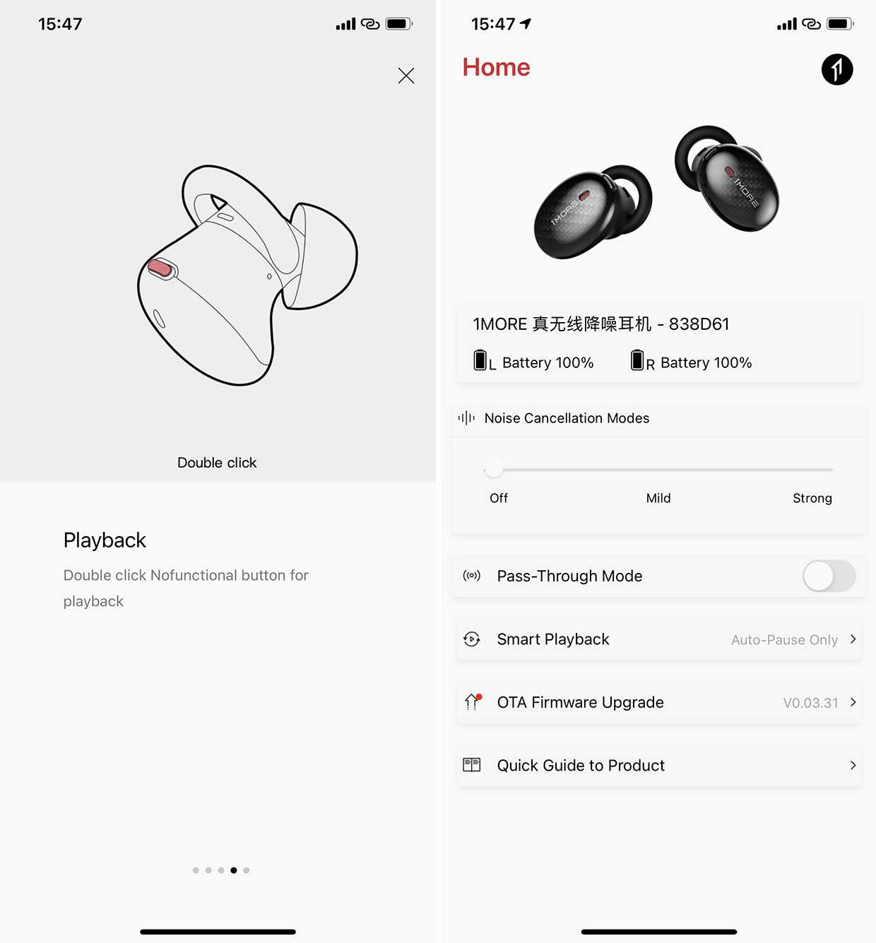 1MORE True Wireless по этому параметру соответствуют ожиданиям. Есть и ANC, и режим проникновения звука. Причём у ANC несколько режимов, которые настраиваются в фирменном приложении 1MORE Music для iOS и Android.