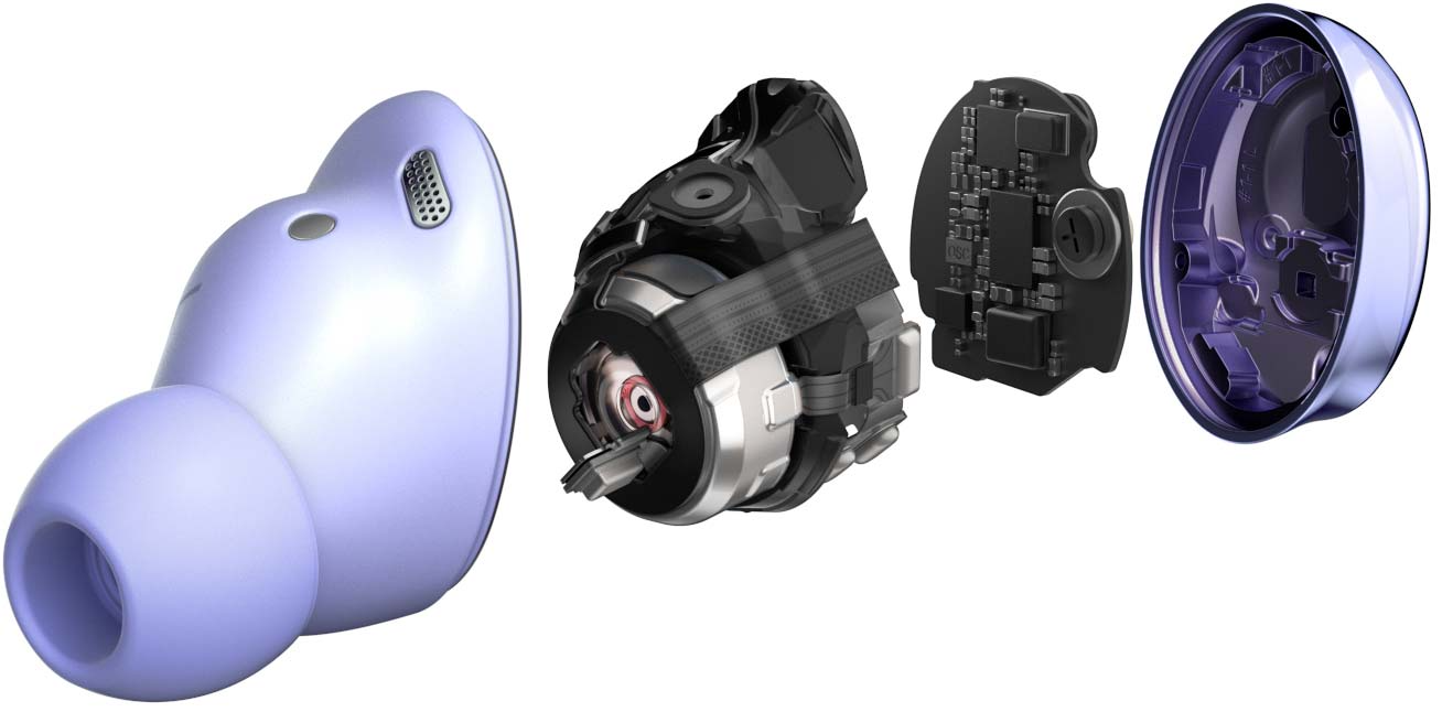 Один из внешних микрофонов высокочувствительный с высоким SNR (соотношение сигнал/шум), что ранее не встречалось в наушниках Galaxy Buds. Кроме того, датчик костной проводимости, который впервые появился в Buds Live, тут также присутствует.