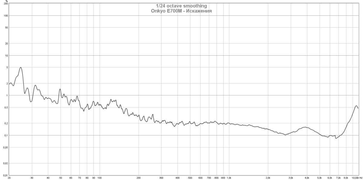 Уровень искажений в басовой области вполне приемлем, а на средних и высоких частотах исчезающе мал. Что характерно — падение уровня искажений происходит на фоне повышения отдачи, а не наоборот.