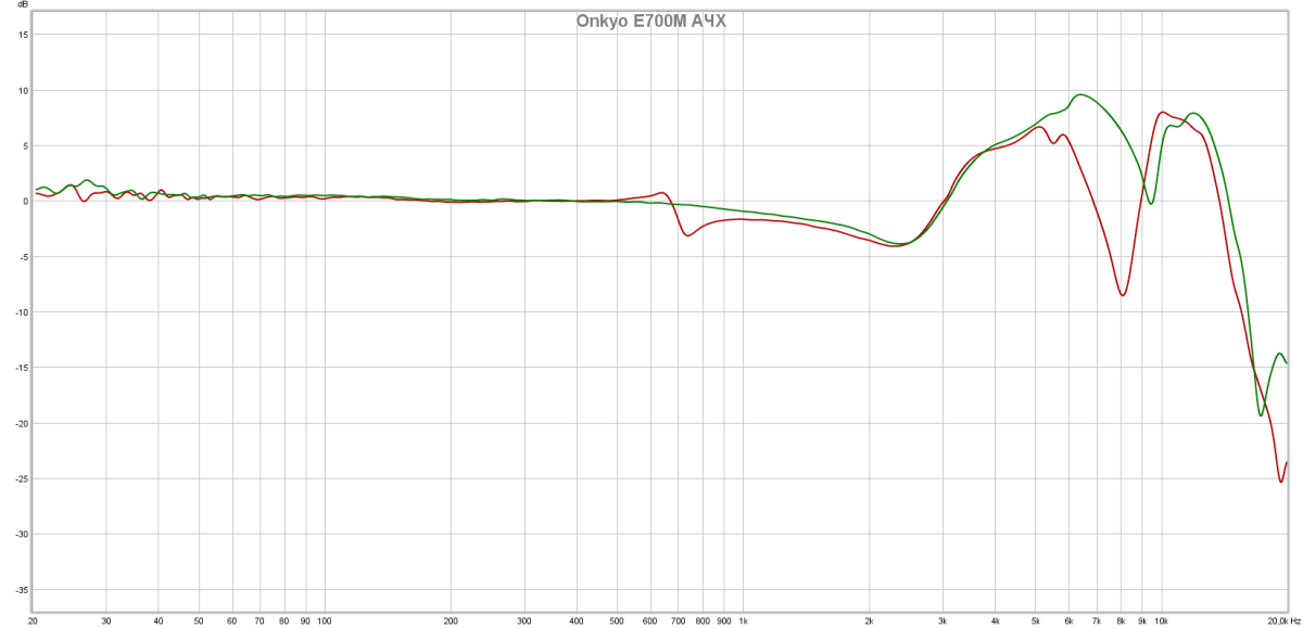 Даже учитывая стоимость и класс качества наушников, АЧХ в СЧ/НЧ-области по-настоящему впечатляет. Левый и правый канал фактически идентичны по отдаче, а график эталонно горизонтален. Небольшой провал в пределах 1-3 кГц вполне приемлем, а далее идет тот самый акцент, который призван убедить нас в том, что наушники хорошо воспроизводят верхние частоты. Два резонансных пика/провала в правом канале (красный график) являются индивидуальной особенностью излучателя или дефектом сборки. На слух данные артефакты не идентифицируются.