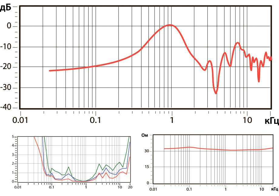 График АЧХ (сверху), график КНИ (снизу слева) и график импеданса (снизу справа)