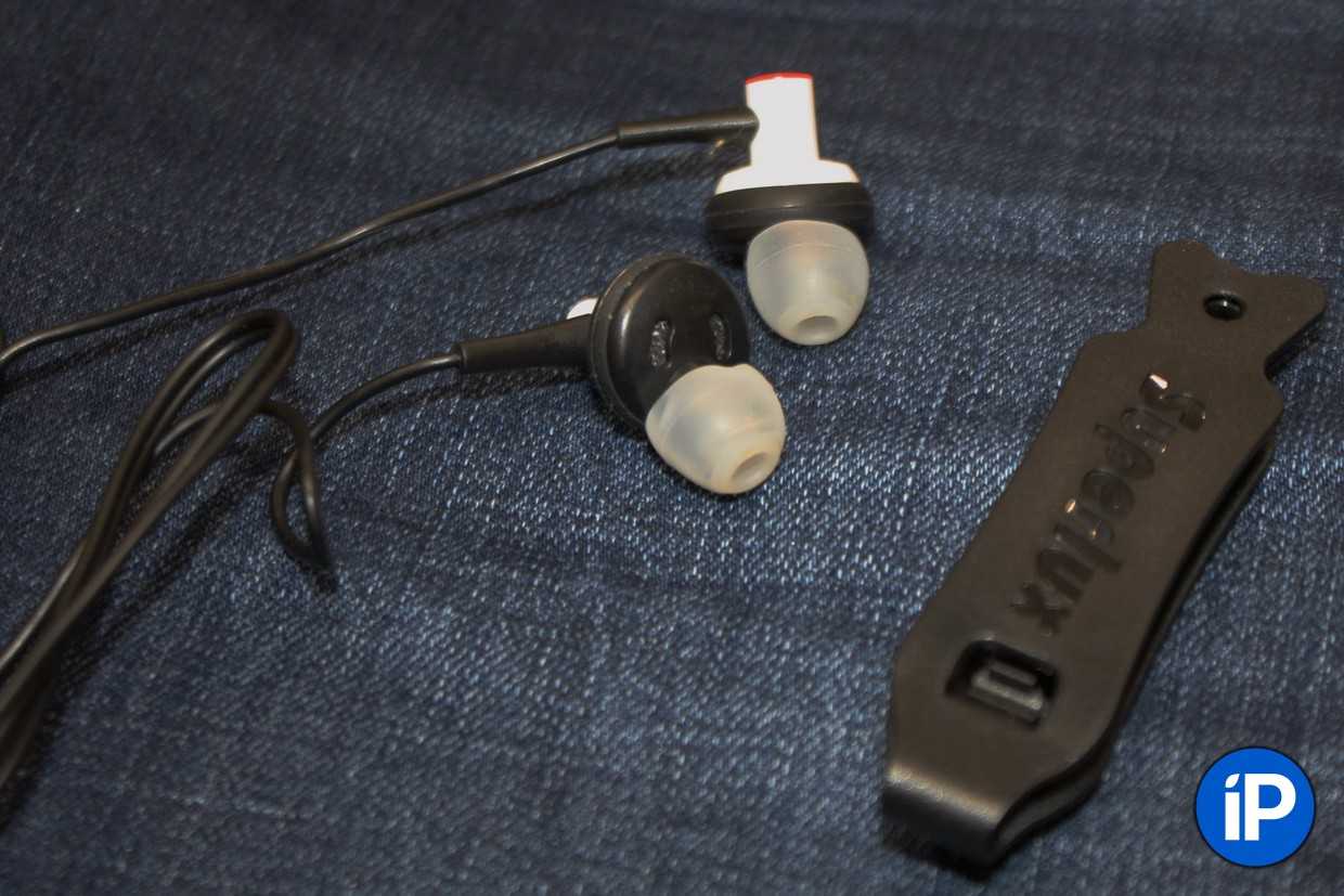 Помимо самих наушников, в небольшой, но в меру оригинальной коробочке спрятаны две пары амбушюр разного цвета и размера (маленькие на наушниках, и пластмассовая клипса для намотки провода.