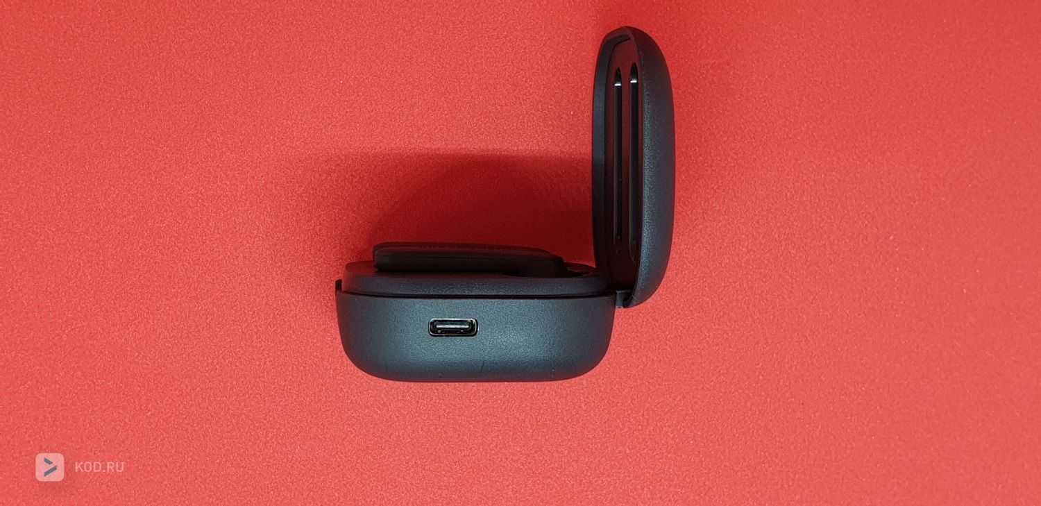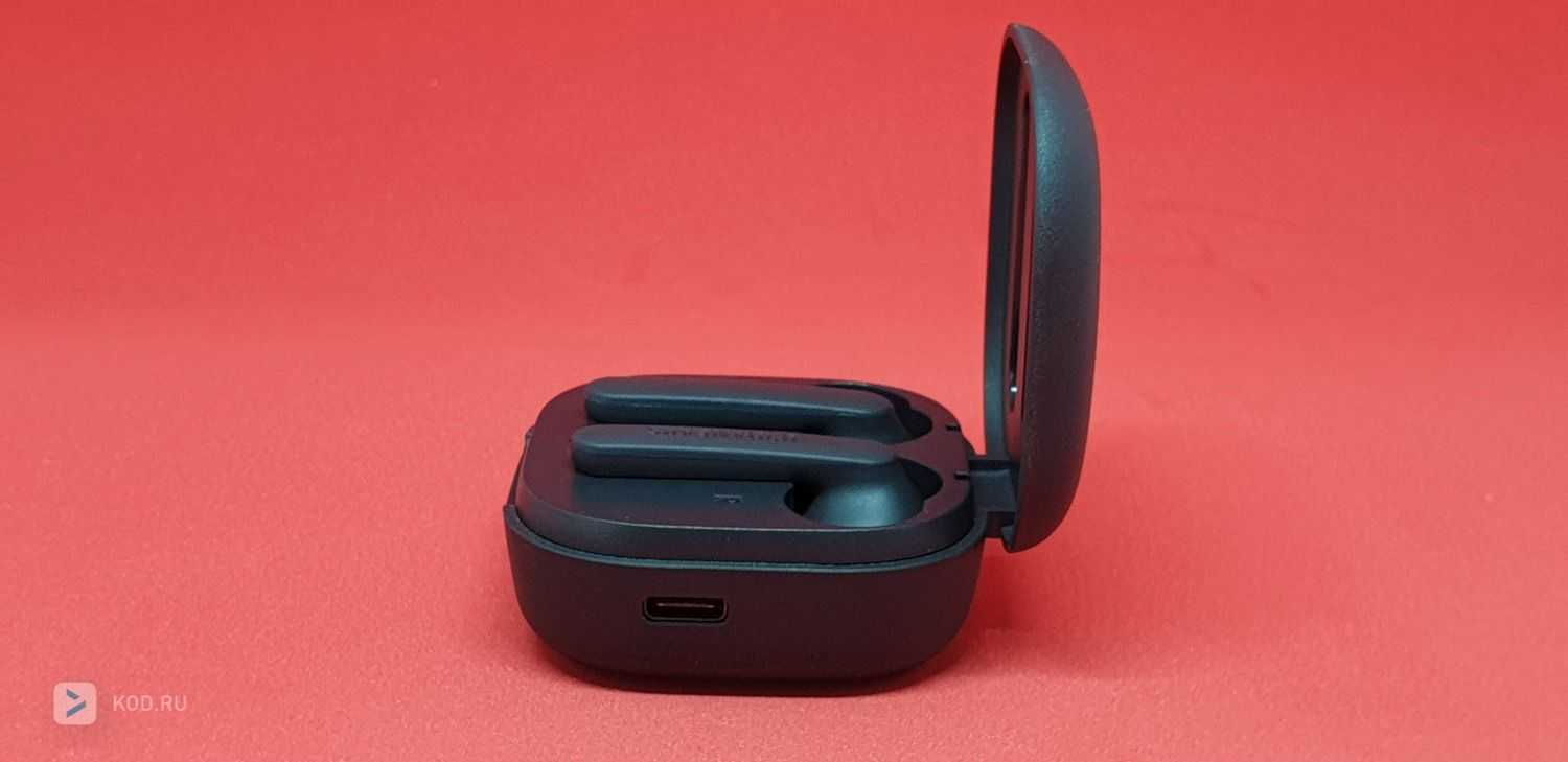 Кейс относительно небольшой, в меру пухленький. Наушники держатся в нём крайне надёжно, даже при открытой крышке вытряхнуть их не получится. Сама крышка закрывается плотно, случайного открытия за период тестирования не наблюдалось. Никаких кнопок на корпусе кейса нет, разъём для зарядки — справа, это USB Type-C. Хорошо, что не microUSB.