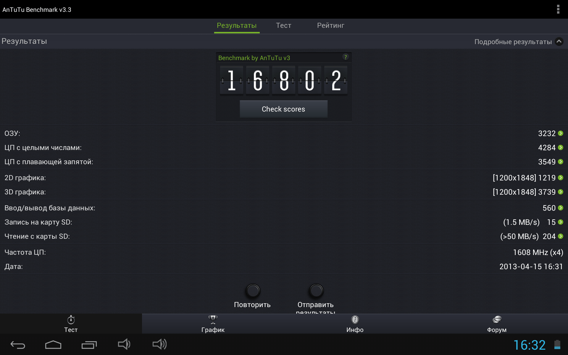 Планшет построен на топовом китайском процессоре Rockchip 3188 Cortex A9 с тактовой частотой 1,6 ГГц, а объем оперативной памяти составляет 2 Гб (такие же характеристики имеет 7-дюймовый планшет Cube U35GT за $200). Cube U30GT2 оборудован небезызвестным графическим ускорителем Mali-400 МР4, хорошо знакомом по таким популярным смартфонам, как Samsung Galaxy S3 и Note 2. Благодаря большому количеству пользователей этих устройств разработчики игр оптимизировали и будут оптимизировать игры и приложения под это графическое ядро, так что проблем с софтом у вас возникнуть не должно. Все современные игры работают без проблем, но подтормаживания иногда случаются из-за высокого разрешения дисплея планшета. Тестирование в самом популярном бенчмарке AnTuTu Cube U30GT2 прошел достойно и набрал 16 800 баллов, что является очень неплохим результатом, особенно как для такого недорогого планшета.