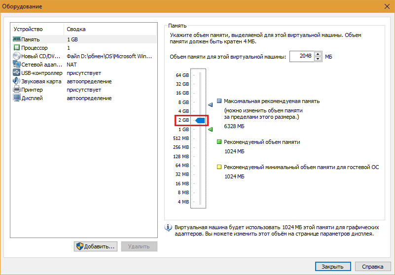 Дальше укажем размер оперативной памяти ВМ. По умолчанию Windows 10 x86 отводится 1 Гб, но вы можете увеличить этот объем, сдвигая ползунок вправо. Если на вашем ПК не очень много оперативки, не отдавайте ВМ больше 2-3 Гб, иначе основная система будет тормозить из-за нехватки памяти.