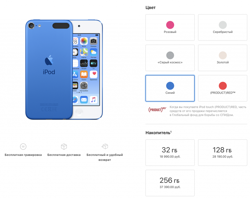 Так мы плавно подобрались к вопросу позиционирования. Ну и кому сейчас нужен плеер? Так и тянет сказать: «Никому». Особенно когда посмотришь на пугающие цены. За iPod touch с 32 ГБ памяти просят 18 990 рублей, модель на 128 ГБ стоит 28 190 рублей, а версия с 256 ГБ памяти обойдётся в 37 390 рублей.