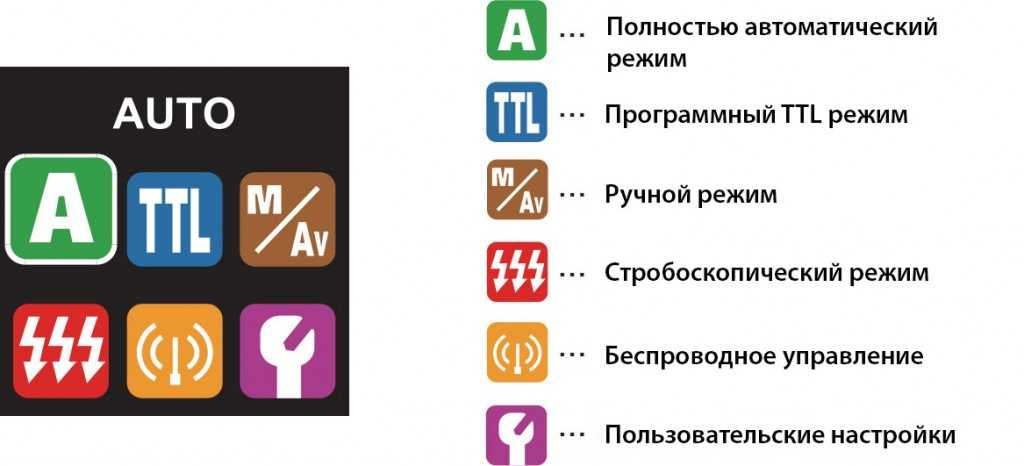 беспроводное TTL управление беспроводной режим в качестве ведущей вспышки беспроводной режим в качестве ведомой вспышки ведомая вспышка (внешний экспозамер) ведомая, с предварительной вспышкой ведомая одиночная вспышка |